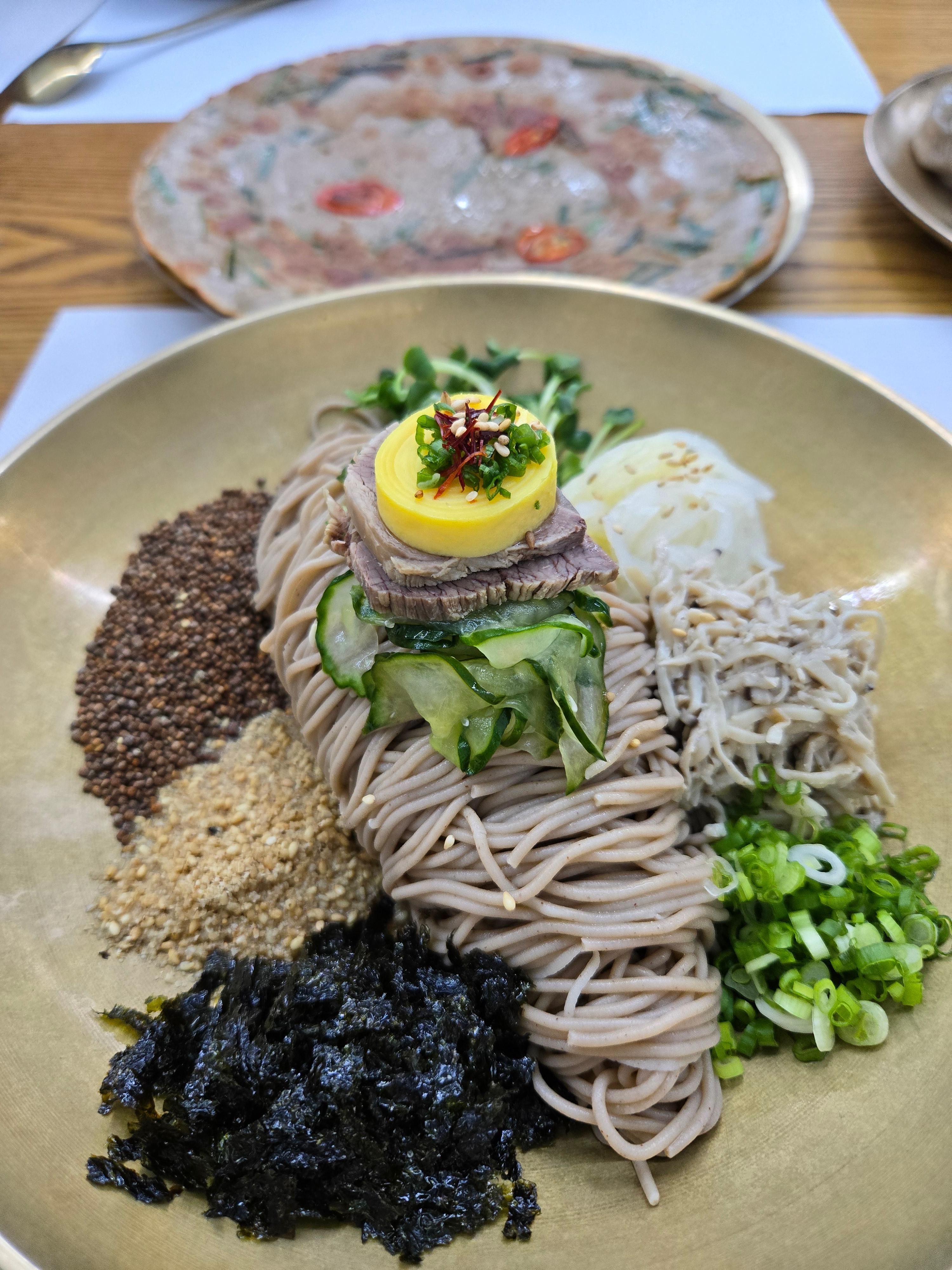 소스가 뿌려져 있나 싶게 간이 안되어 있는 것처럼 보이지만 사실 안쪽으로 슴슴하게 간이 되어 있고, 두 종류의 깨와 나물, 김가루 등이 만나 메밀 본연의 고소함을 살리고 감칠맛을 극대화한 메뉴였다. 서울 어디서도 절대 맛볼 수 없는 제주의 맛, 그 자체.