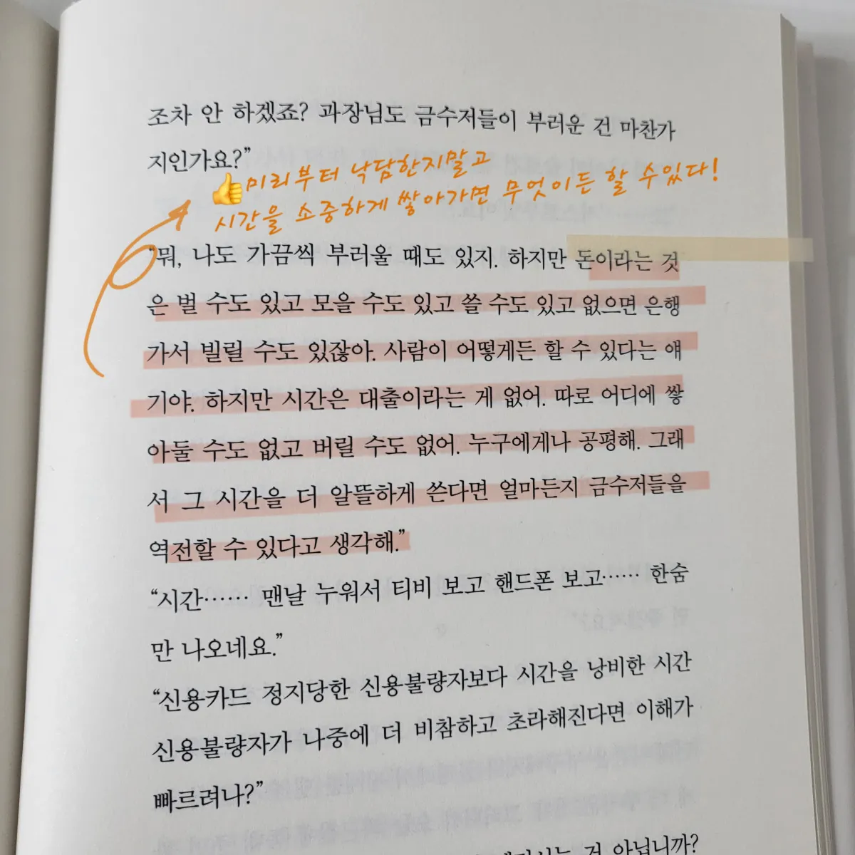 진짜 경제적 자유는 말이야. 재정적인 여유와 정신적인 자유가 합쳐져야 해. 그게 진짜 경제적 자유라고 봐. 햇살 좋은 날에 차 한잔하면서 미래에 대해 생각할 수 있는 여유, 돈 걱정 없이 가족과 보내는 행복한 일상, 가까운 친구들과 함께하는 소중한 추억. 그런 게 진정한 경제적 자유가 아닐까 싶어. - 페이지 241