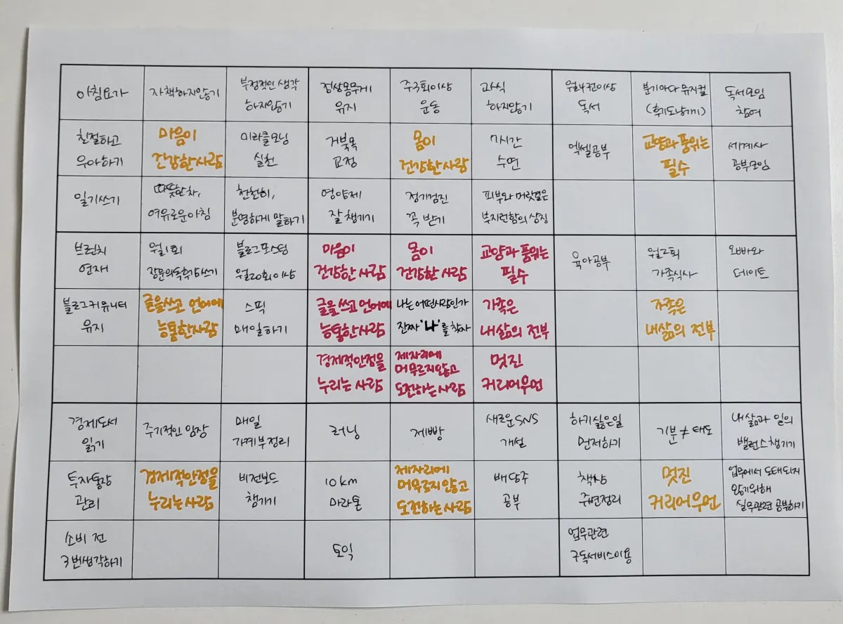가운데 칸에 꿈, 건강, 도전 등과 같은 단어를 열심히 넣고, 그걸 이루기 위해 내가 하고 싶은 일을 적어서 예쁘게 만들었는데, 뭔가 좀... 아쉬운 마음이 들었다.
