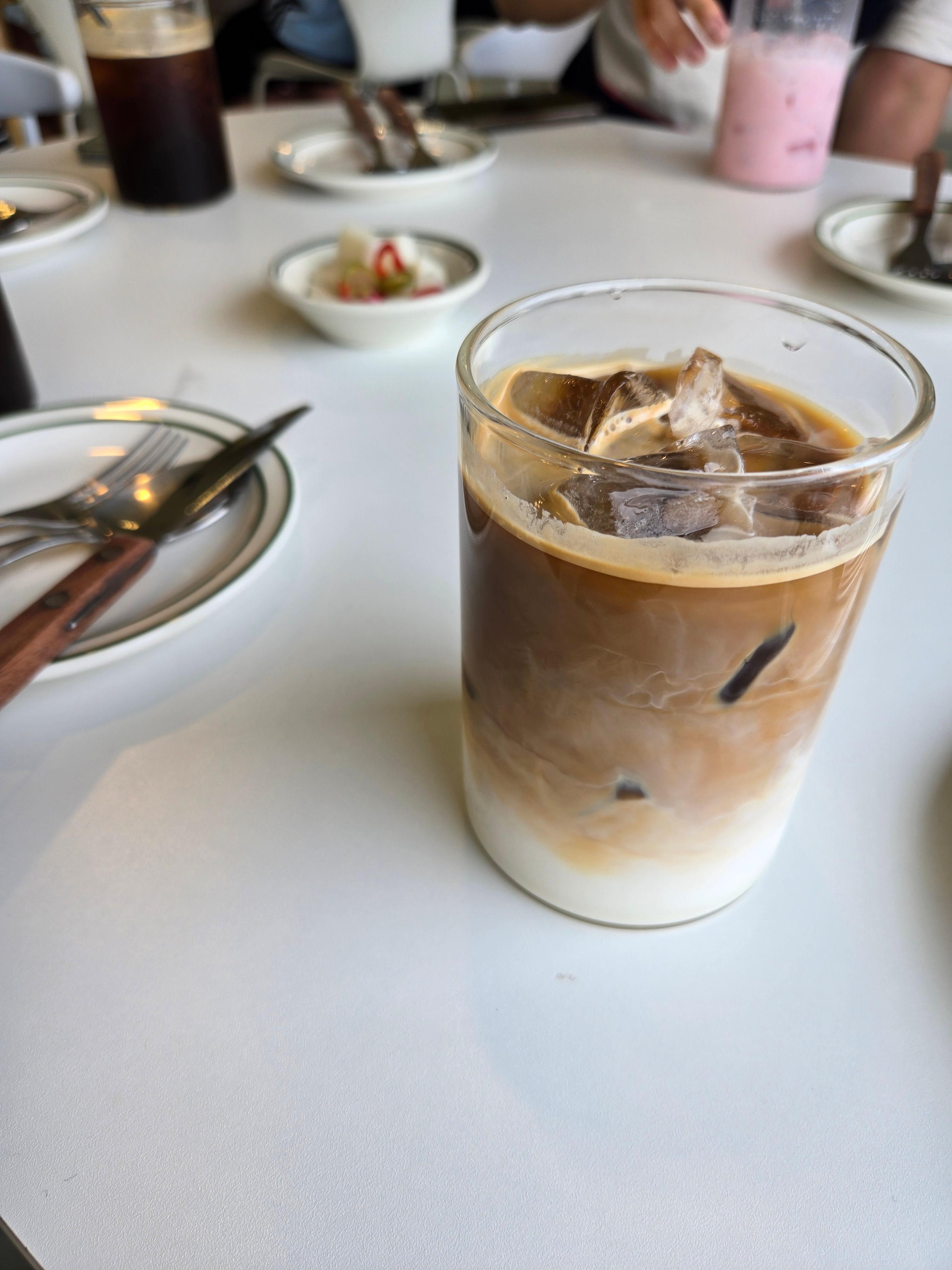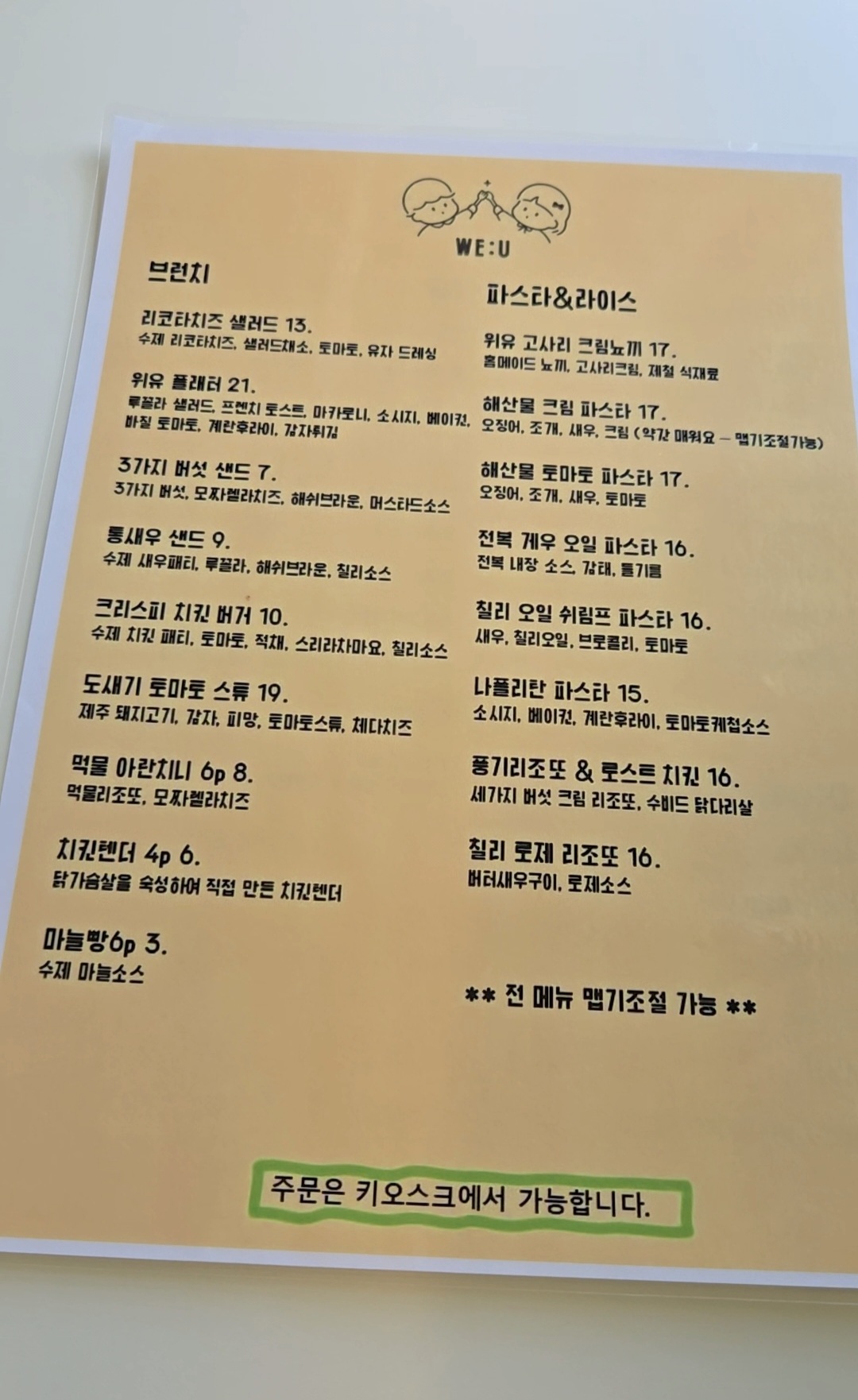 우리는 전복 게우 오일 파스타, 통새우 샌드, 위유 플래터, 아메리카노, 아이스라떼, 딸기라떼, 오미자 에이드를 먹었다.