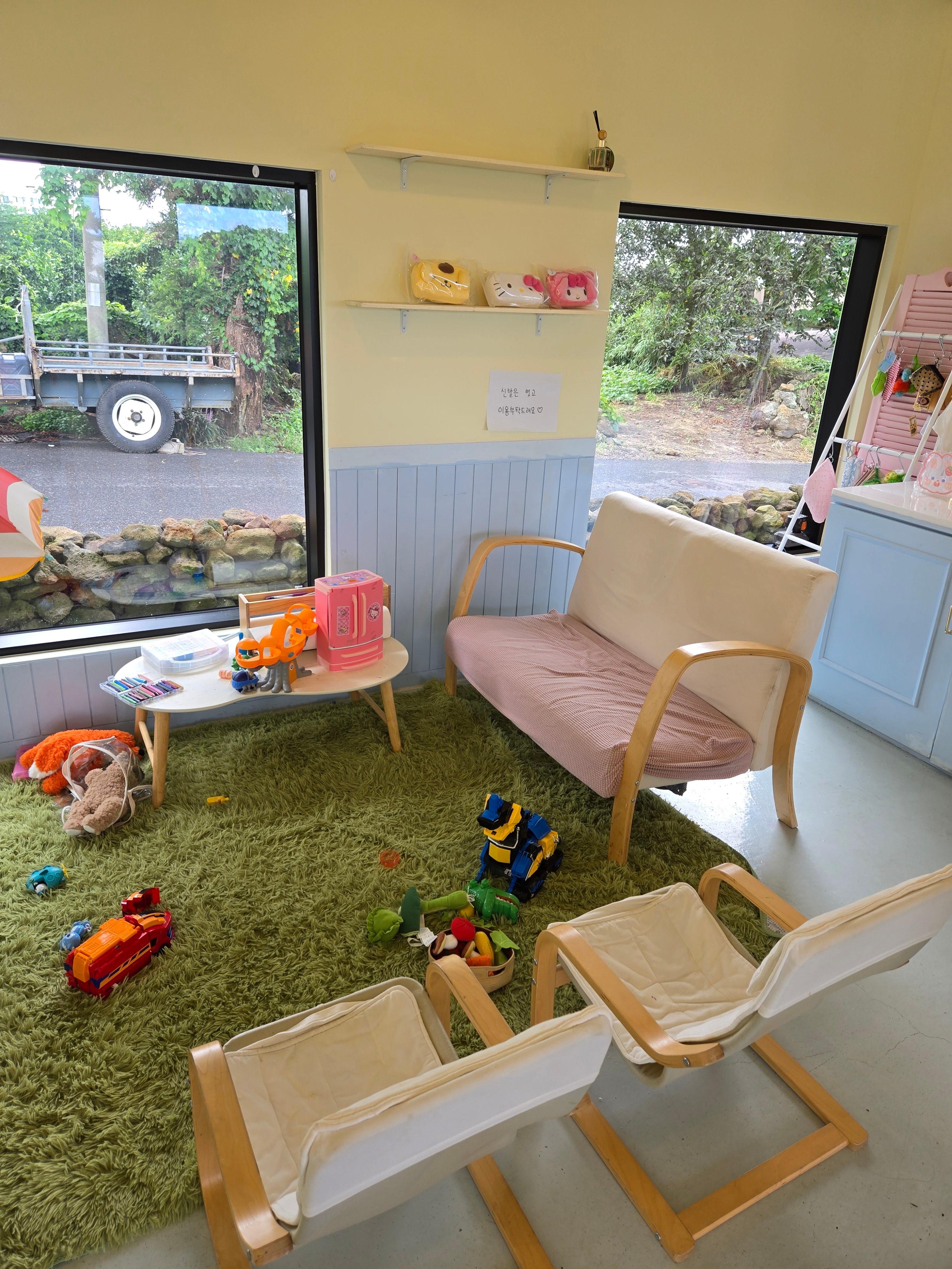 한켠에 마치 잔디를 연상케 하는 매트와 의자가 깔려 있고 아이들이 놀기 좋은 장난감과 색연필, 종이 등이 갖춰져 있어 아이들을 자유롭게 시간 보내게 하기 매우 좋다.