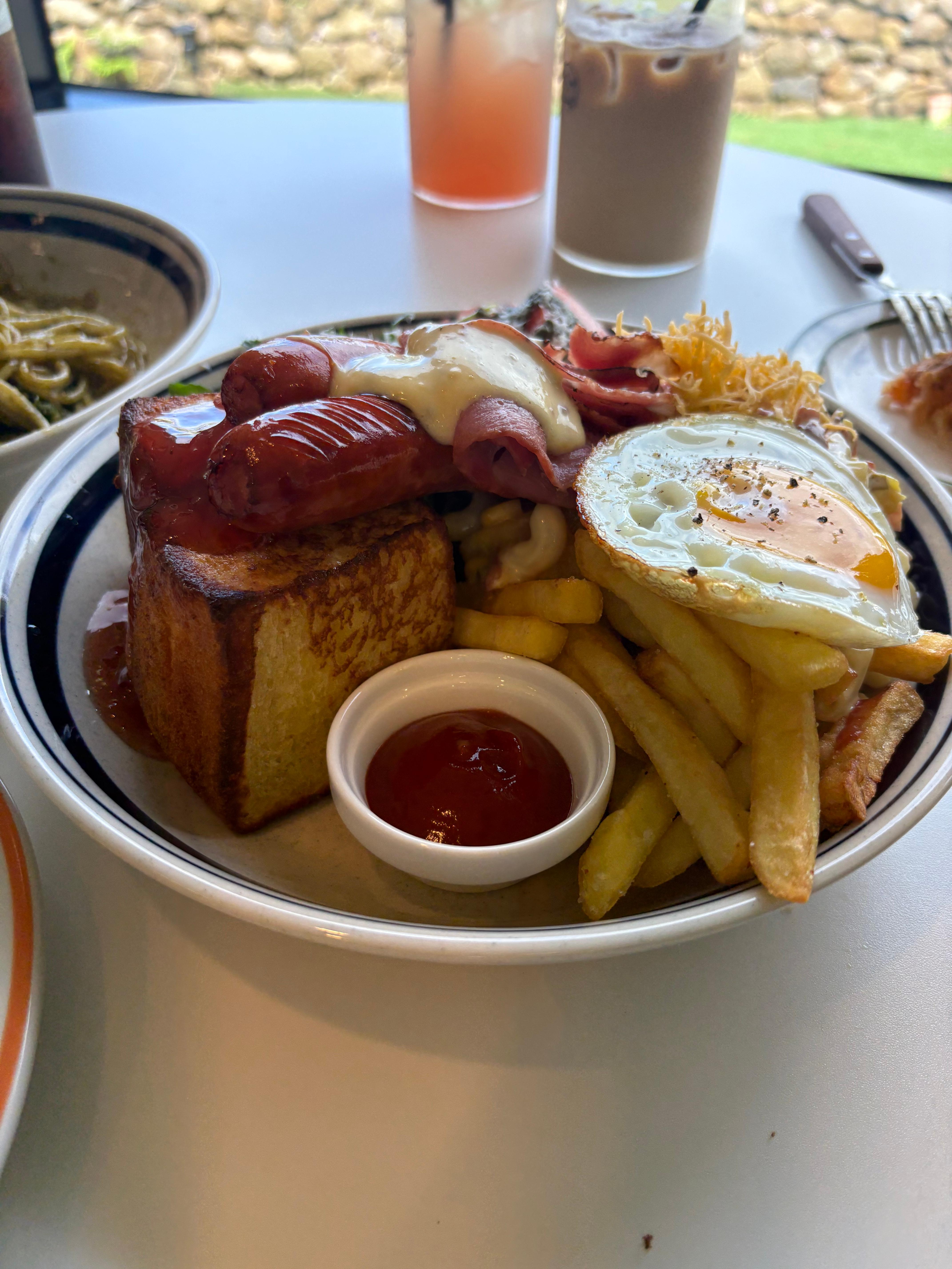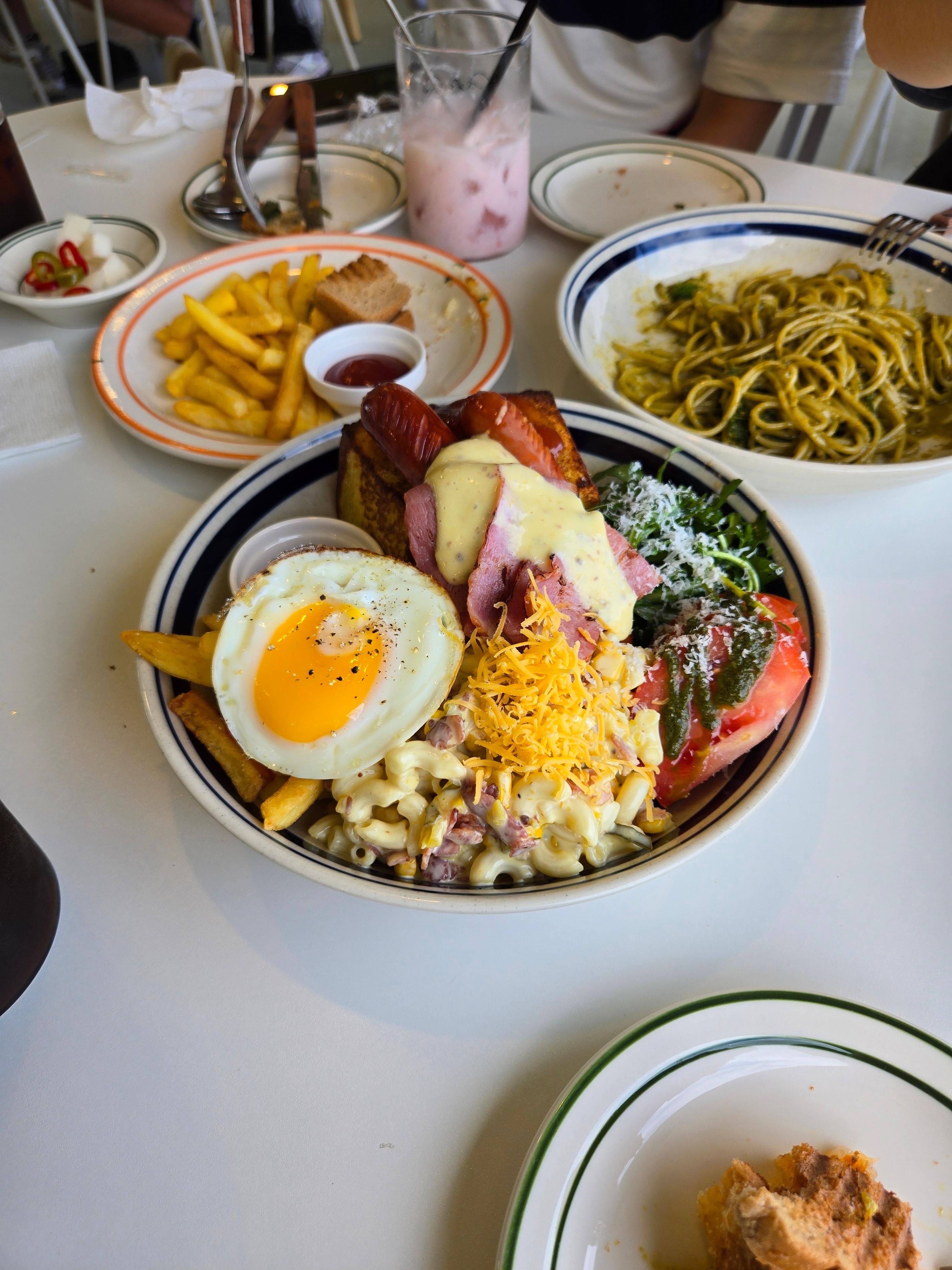 위유 플래터 - 옆 테이블에서 먹고 있는 프렌치토스트가 너무 맛있어 보여 고른 메뉴. 겨자소스에 잘 버무려진 마카로니 샐러드와 유자소스가 곁들여진 루꼴라 샐러드, 통통 쫀득 그 자체였던 소시지, 감자튀김과 반숙계란, 베이컨, 토마토 그리고 가장 먹고 싶었던 딸기잼이 적당히 더해진 프렌치토스트까지 메뉴 구성이 무척 알찼다.