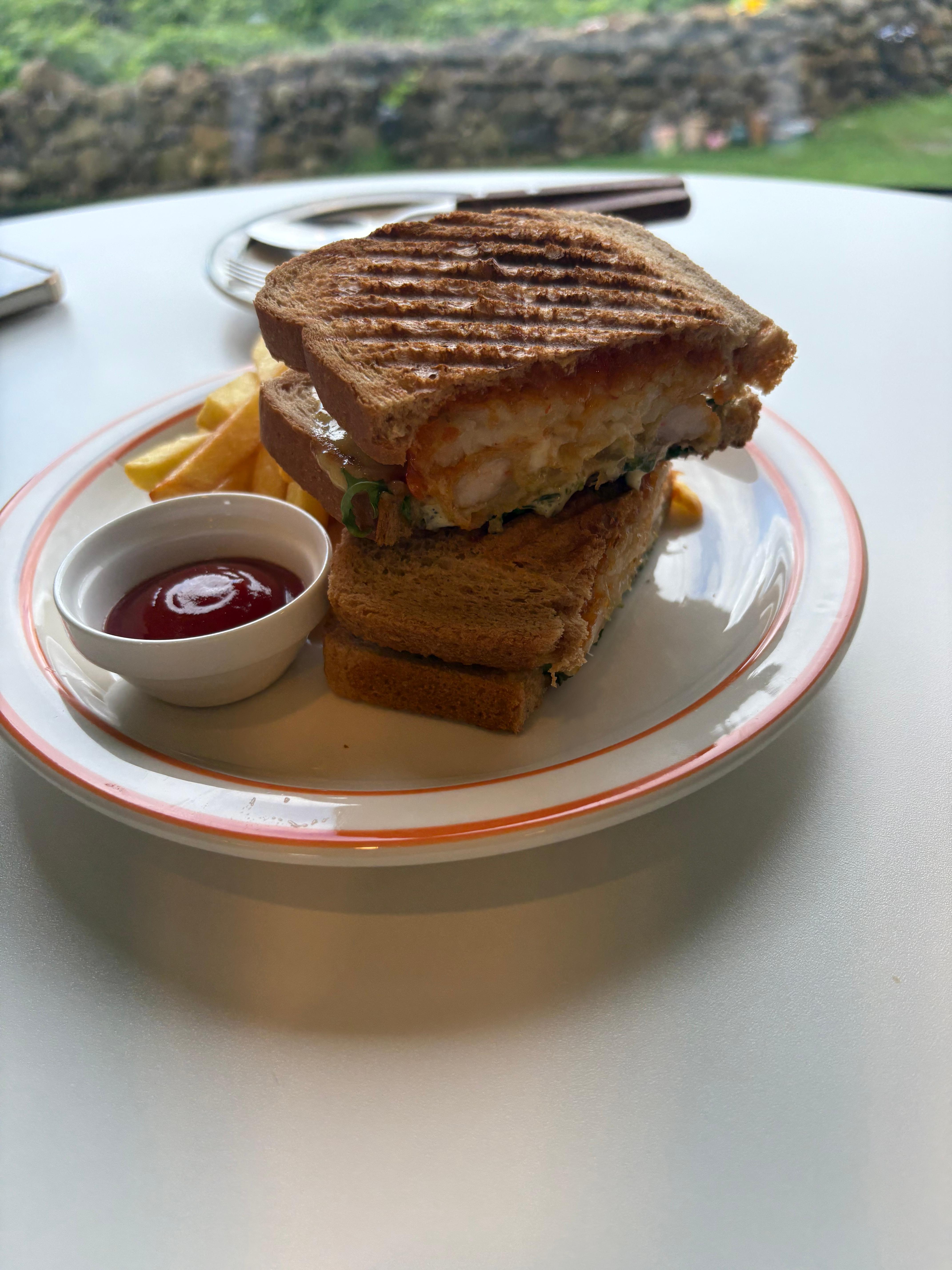 통새우 샌드 - 통새우가 정말 통통하게 들어간 샌드위치였다. 소스가 맛있었고, 따뜻하게 튀겨진 두툼한 통새우와 조화가 정말 일품이었다!! 감자튀김도 같이 나와서 든든하게 먹기 좋다.