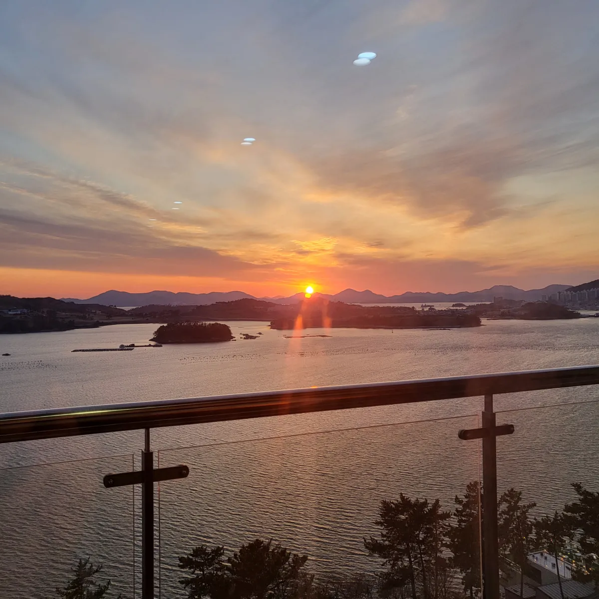 오션힐호텔 뷰의 끝판왕은 '바다석양뷰'라고 생각한다! 멀리보이는 섬들로 넘어가는 해를 침대에 누워서 볼 수 있고, 테라스에 나가서 저 붉은 아름다움을 오롯이 방해받지 않고 즐길 수 있다.